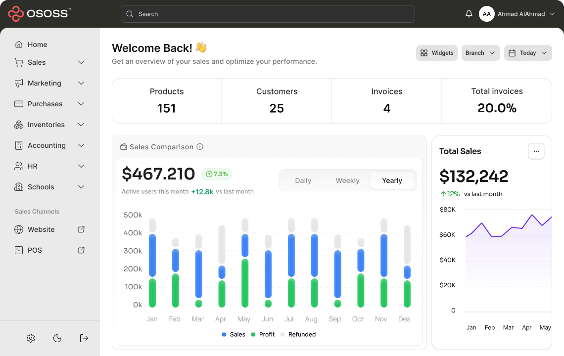 OSOSS helps you centralize every transaction, synchronize stock, and track performance in real time across POS, e-commerce, and delivery channels.